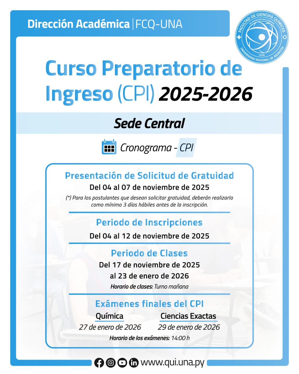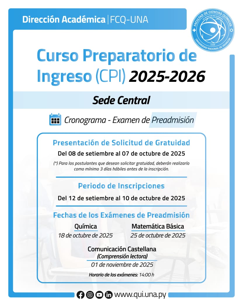 Consultas al contacto (021) 7290030 int. 141 – email: admision@qui.una.py
