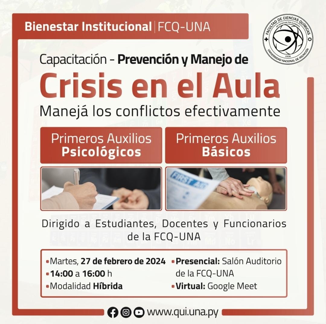 Trabajo coordinado de Bienestar Institucional  para la preparación y ejecución de Capacitación: Prevención y manejo de crisis en el aula. Dirigido principalmente a Docentes y abierto a la Comunidad Educativa de la FCQ-UNA, en el marco del Plan de Capacitación  anual presentado con la Dirección Académica con 98 Participantes.