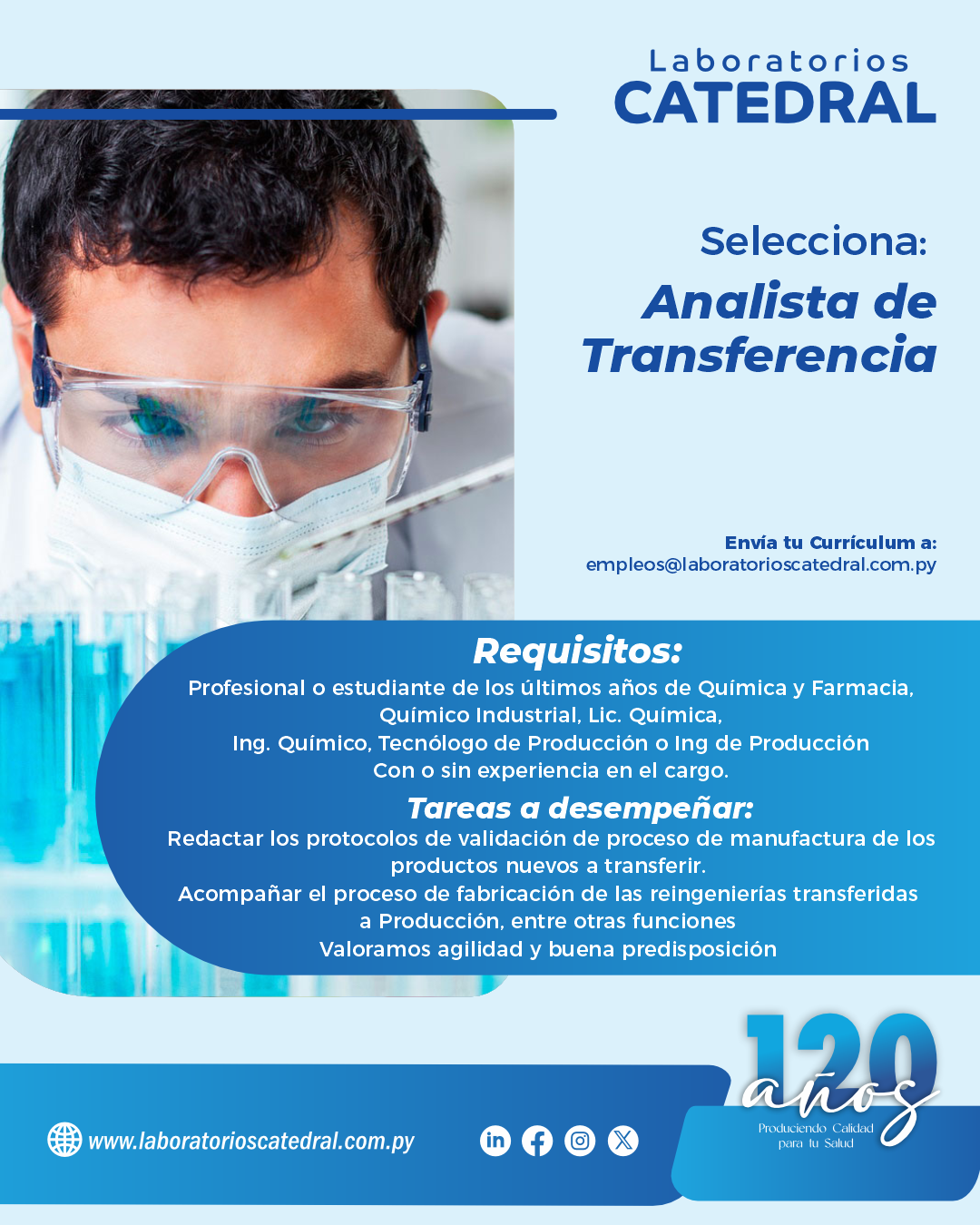 🔹 Formación Académica: Profesional universitario egresado de la carrera de Ingeniería Química o Licenciatura en Química